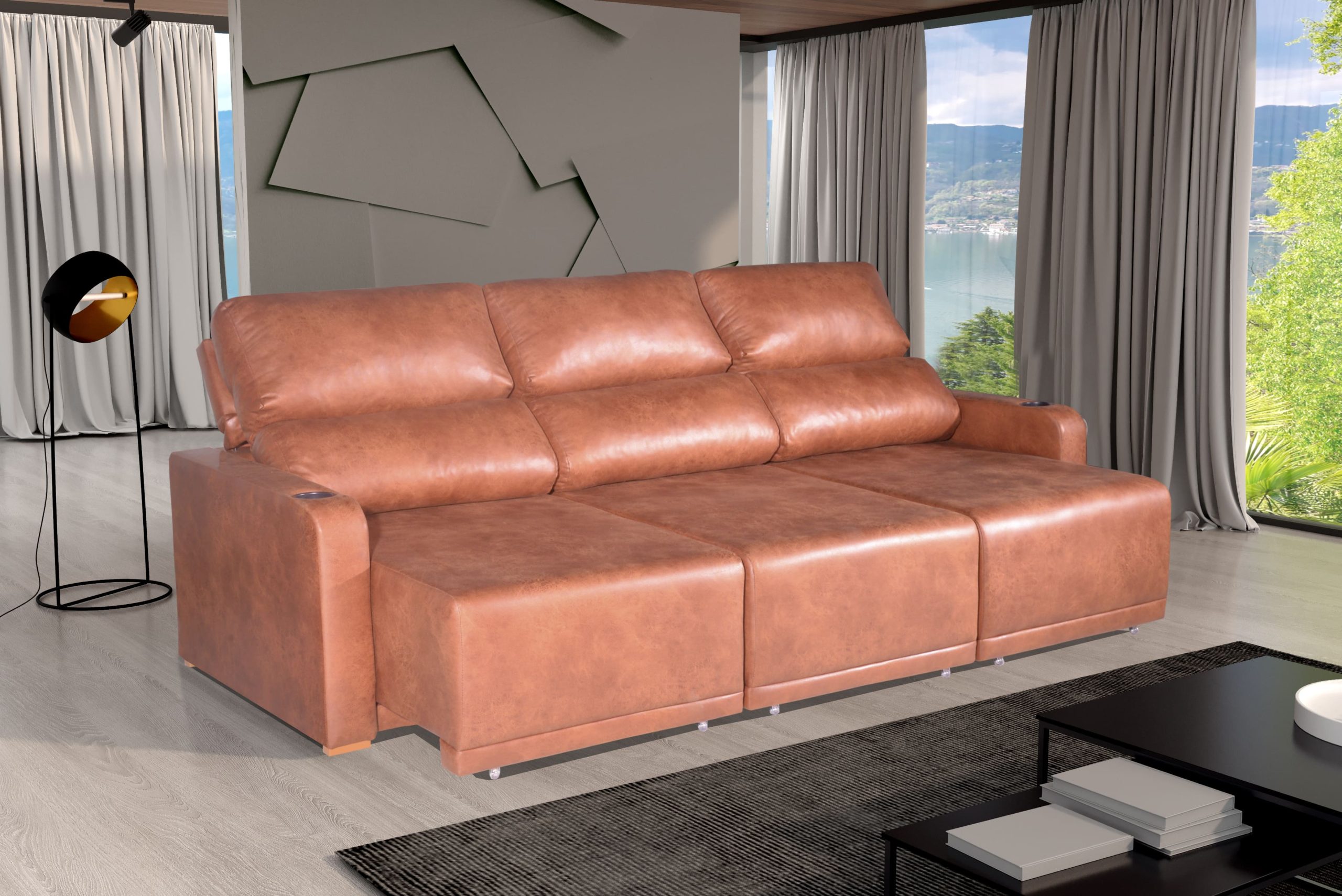 Estofado retrátil e reclinável com três módulos que possui um revestimento em veludo PU, braços com porta copos, assento de espuma em densidade D33 e encosto removível composto 100% por fibra de silicone. Com uma largura de 2,50 metros, altura de 1,03 metros e profundidade fechado de 1,00 metro, este sofá oferece um design compacto e versátil.Ideal para momentos de descontração, o sofá se transforma com sua característica retrátil e reclinável. Quando fechado, apresenta uma profundidade de 1,00 metro, e ao ser aberto, revela uma profundidade expandida de 1,55 metros, proporcionando conforto personalizado. Capaz de acomodar 4 pessoas, este sofá é perfeito para ambientes aconchegantes.
