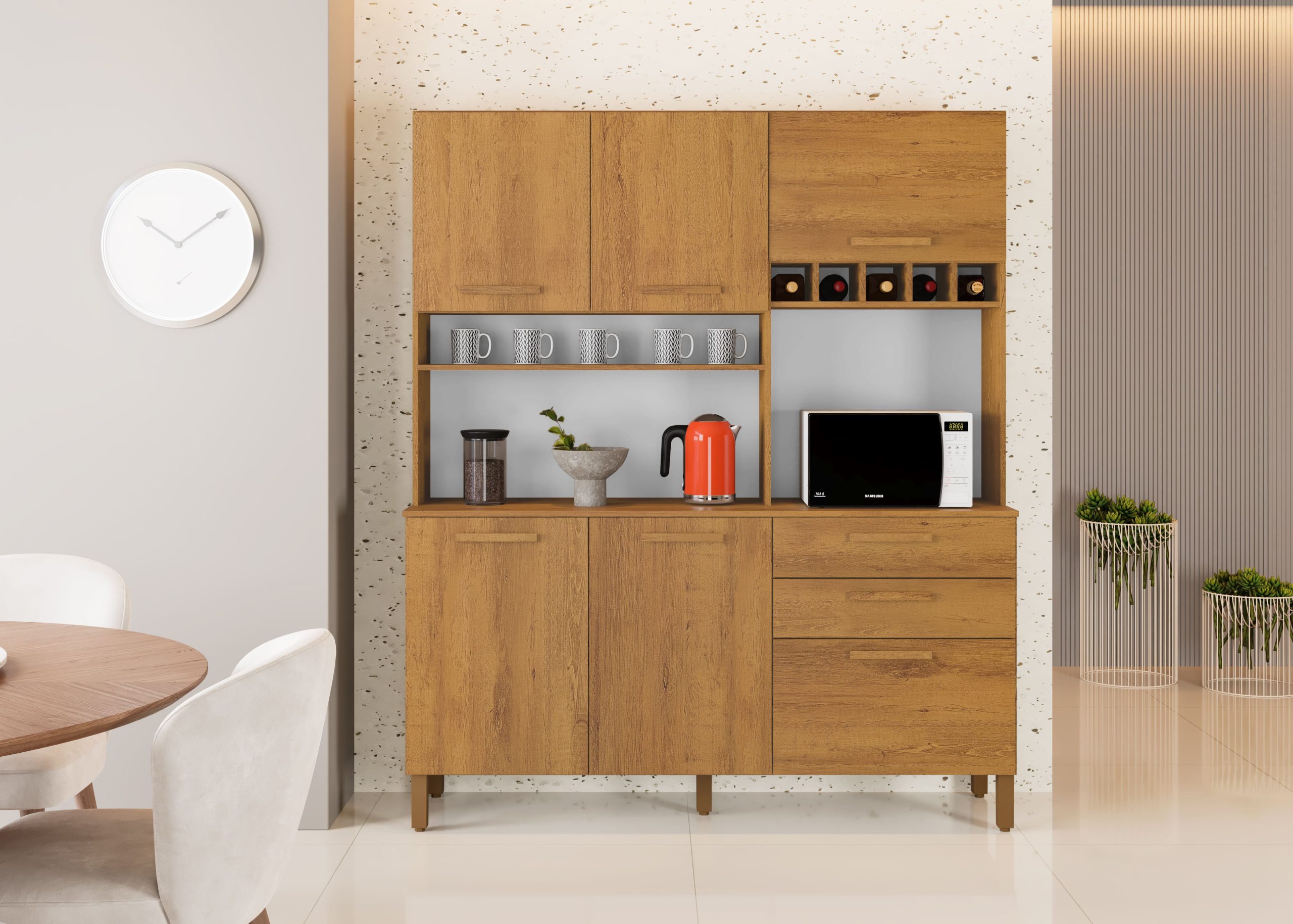 Esse kit de cozinha na cor cinamomo possui um design moderno, deixando o ambiente mais funcional e seguro. O produto conta com amplo espaço interno e prateleiras para melhor organização, sendo ideal para quem procura praticidade e beleza. Possui pistão à gás na porta basculante, corrediças telescópicas em suas gavetas e pés reguláveis. Em seu acabamento, o produto conta com pintura texturizada UV e pintura UV semi-brilho.