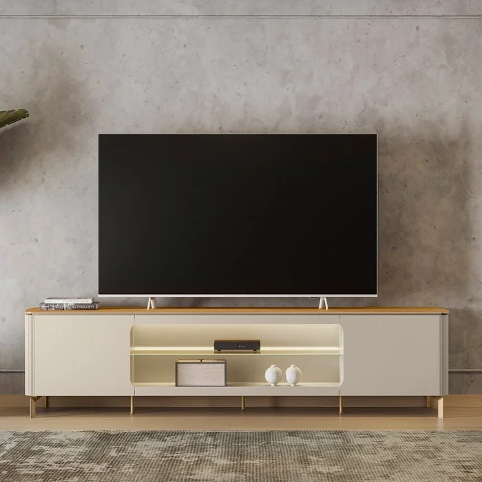 O rack apresenta uma prateleira de vidro, luz de led, duas portas e cinco pés de metal que dão a ele um toque ainda mais moderno.