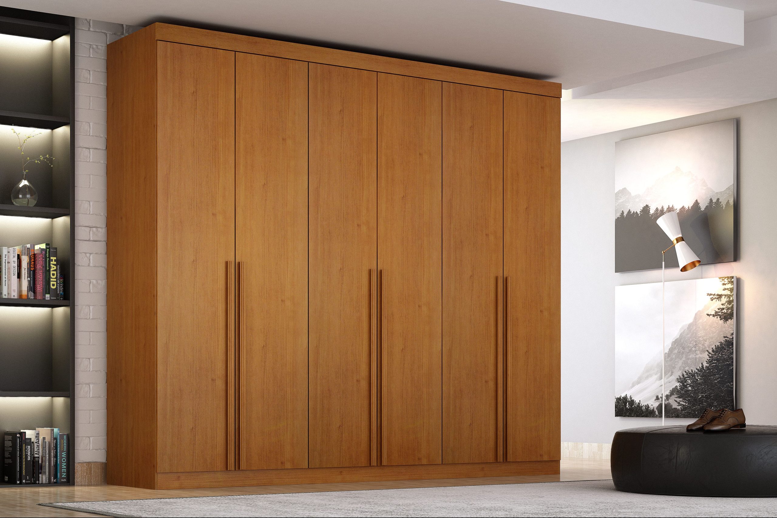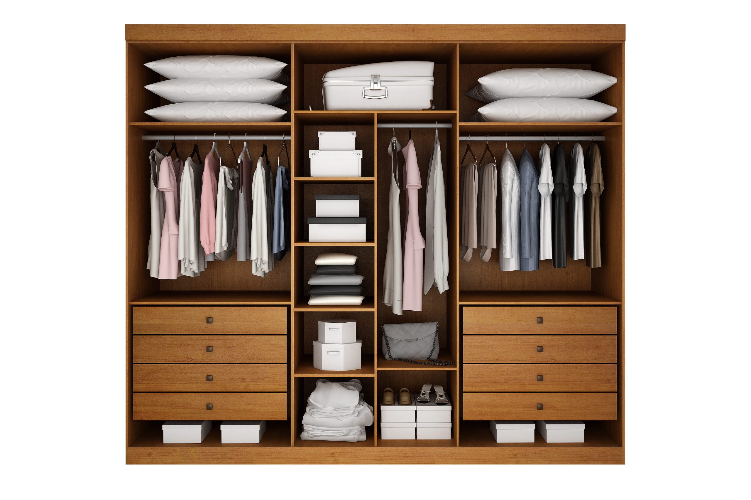 Esse roupeiro 100% MDF, possui acabamento texturizado, moderno, encontrado apenas nas melhores fábricas de Minas. Este produto possui um contexto de conforto, qualidade e satisfação que atraem até os clientes mais exigentes, é um móvel conceitual e imponente, ele impressiona por sua grandiosidade, pelos espaços bem distribuídos e os detalhes pensados para atender as mais variadas necessidades do usuário, são eles: puxadores em mdf alongados com design moderno e funcional, portas com dobradiças slow 35 mm, cabideiros e calceiro metálicos, nichos central para acessórios, sapateiras e espaço para longos, gavetas com corrediças telescópicas e uma gaveta cofre com chave, para acomodar os seus pertences e proporcionar a melhor organização do espaço e segurança.