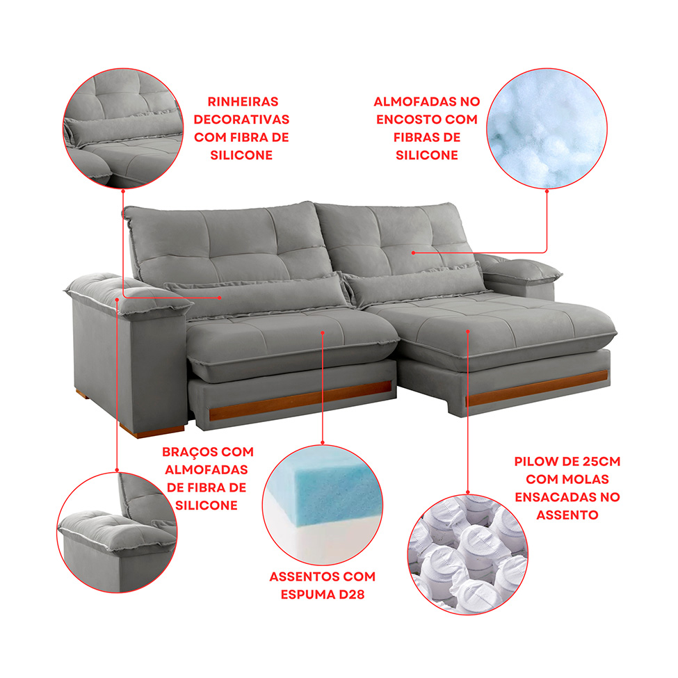 Estofado retrátil e reclinável com 2,5 metros de comprimento seu assento é em espuma D28, com molas ensacadas, percintas elásticas e pillow top de 25 cm. Seu encosto é regulável por catracas em 6 estágios e possui enchimento em fibra siliconada. Seu braço possui almofadas com fibras de poliéster siliconadas. Ele possui detalhes em couro e pés em madeira.